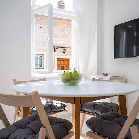 Max ferielejlighed ligger i hjertet af Trogir og har et samlet areal på 40 m^2. Værelser er udstyret med en et tekøkken, et fladskærms TV med satellitkanaler og klimaanlæg samt et fuldt udstyret køkken med et køleskab, en ovn og glas.